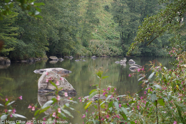 Immer wieder kehrt bei der Ilz ruhe ein, spiegelglatt gleitet sie dahin und vereinzelt ragen Felsen heraus die sich im Wasser spiegeln, dann wieder springt ein Fisch, in meiner Vorstellung eine fette Forelle.