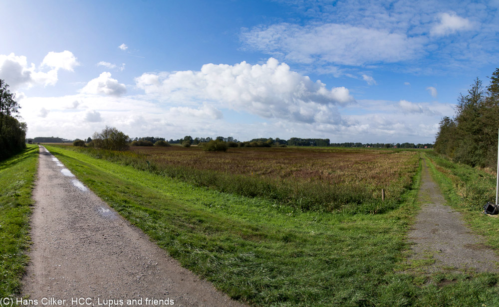 Wenn man auf dem Deich steht kann man ganz schön weit in die alten Wiesen schauen, heute werden die zum großteil wieder unter Wasser gesetzt.