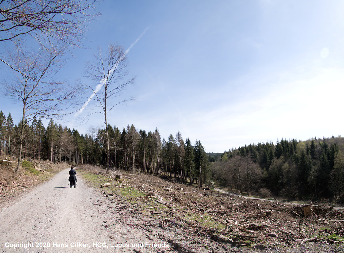 Dafür dann auch die ersten weiten Blicke, wo es vor wenigen Monaten noch schattig war, hier ist jetzt freie Sicht und der Rest des Waldes, nun ja, wir vermuten eine Frage der Zeit, dann ist der weg.