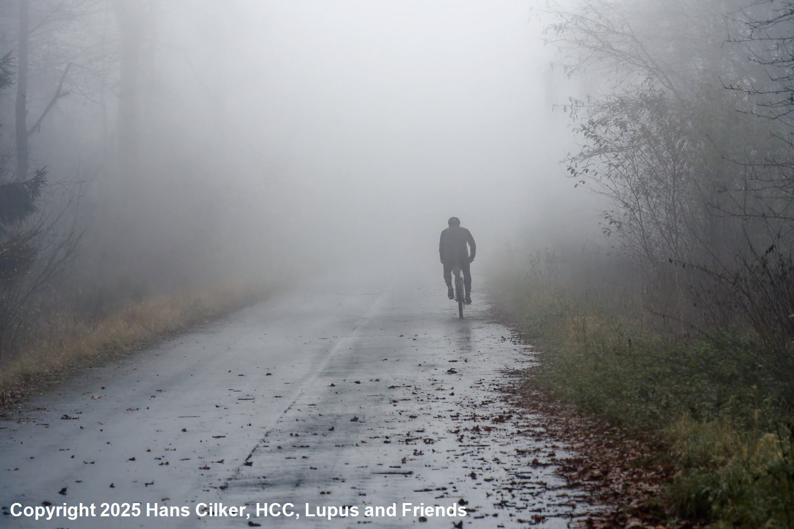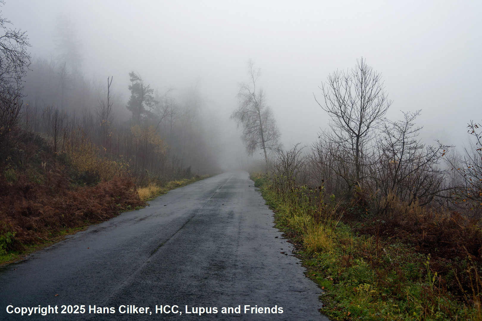 Da versinkt die Egge im Nebel, nass und fett hängen die Tropfen an den Bäumen. Die alte Raketenstrasse, sie ist von der Schranke versperrt.Immer noch gut in Schuß geht sie den Berg hinauf bis fast zur alten Überwachungsstation, ich kenne die noch, da war Sperrgebiet hier oben.