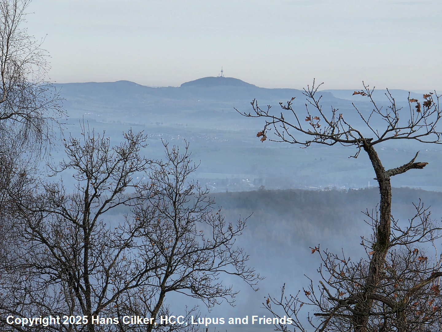 Rauf zum Eggeturm bei schönem Wetter, Sonne und eine im Dunst verschwindende Landschaft.