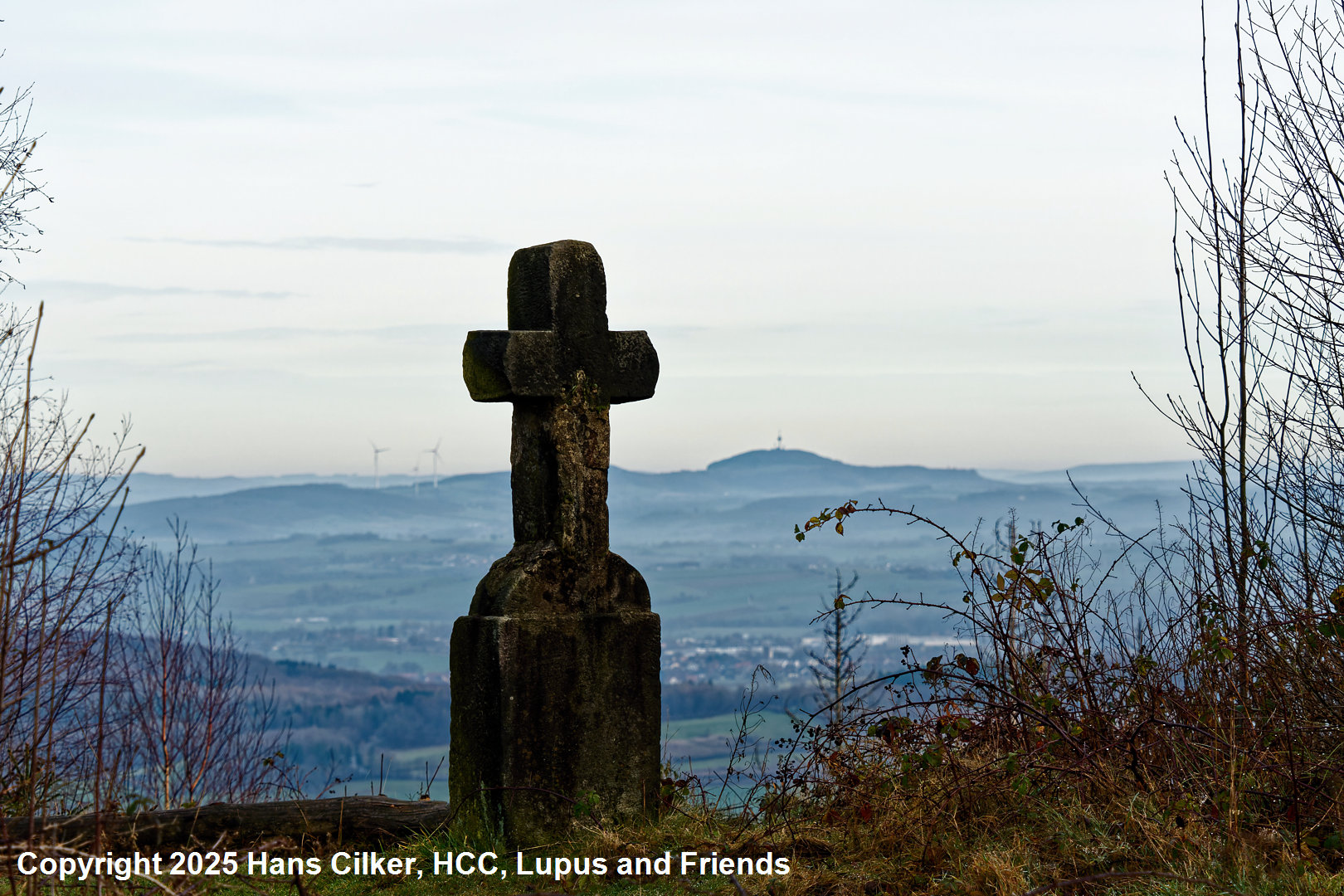 Ein Steinkreuz am Wegesrand vor der Weite der Landschaft…